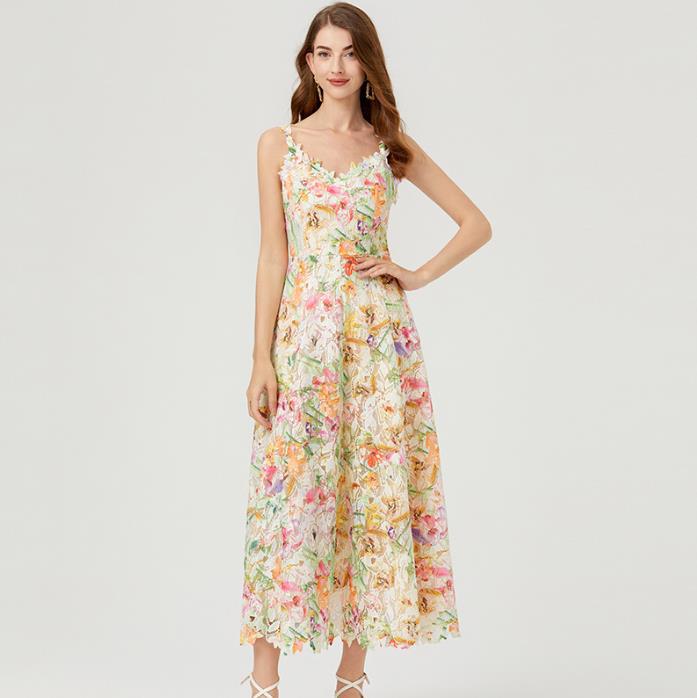 New Summer Women's Dress – Colorful 3D Floral Embroidery, Hollow Out Design, Water-Soluble Lace Skirt