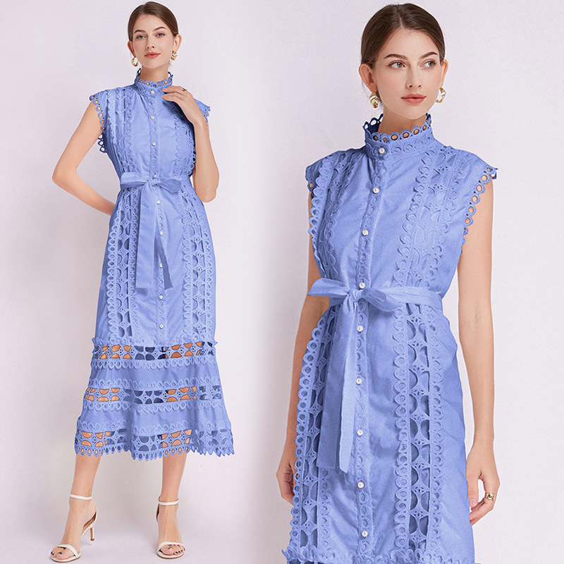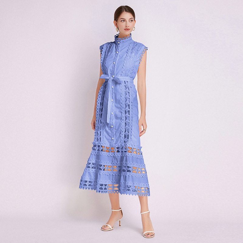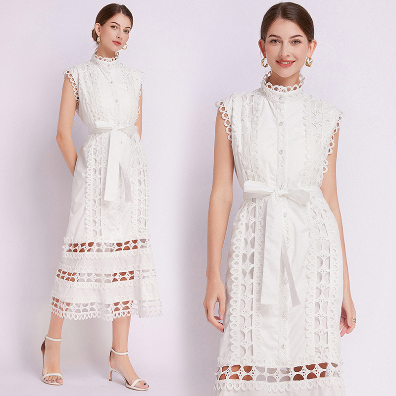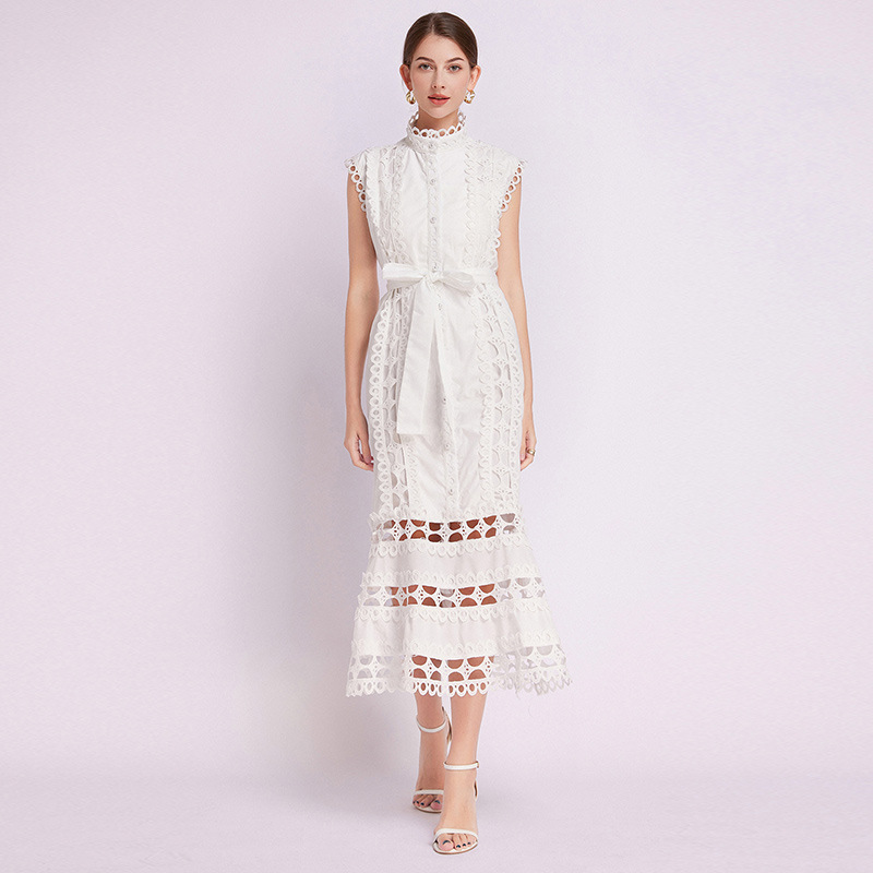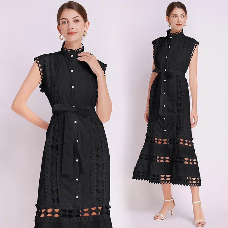 New Summer Women's Palace Style Dress – Hollow Lace, Stand Collar, Slim Fit, A-Line Long Skirt
