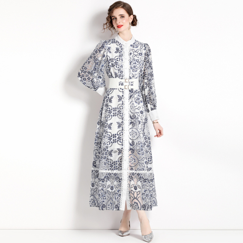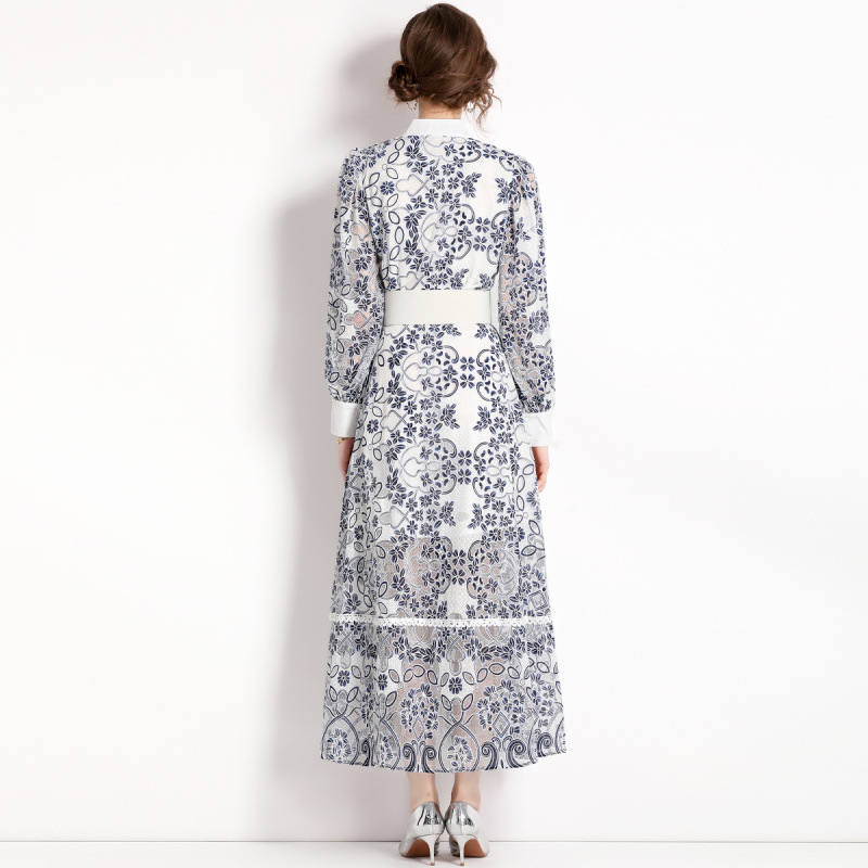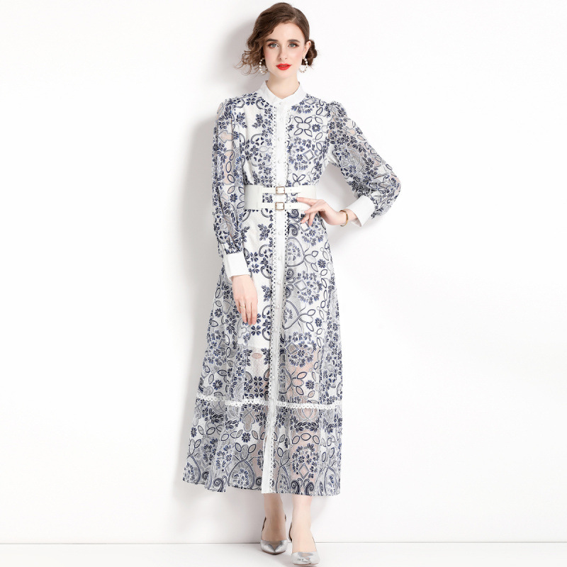 Women's Real Shot Long Dress – Lantern Sleeves, Single-Breasted Design, Mesh Detailing, Lace-Up Waist